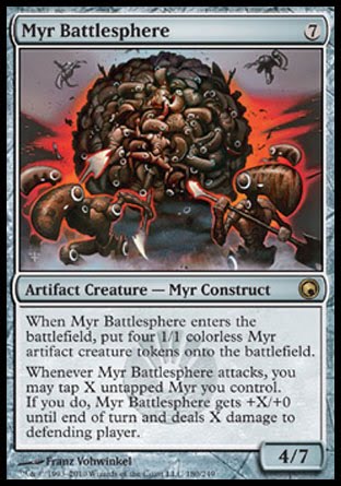 Myr BattlesphereIt truly insane how good the Battlesphere is in this deck. Its on the high end of the curve at 7 mana, but when it hits the table, watch out. It enters as a 4/7, with four additional 1/1 Myrs. Combine it with Kiki, and now you have two 4/7s, and eight 1/1 Myr. The copied Battlesphere has haste, so don’t hesitate to attack right away with it, tapping all eight of the newly created 1/1 Mrs, and the original Battlesphere to deal 9 damage directly to your opponent before he has to deal with the now 13/7 rolling ball of death in the attack phase. Whoa. Make sure to do it again next turn too.